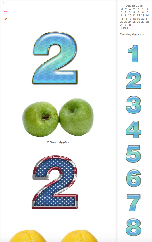 Above: In the Counting portion of the site each number has 3 examples of fruits or vegetables that have the same quantity as the number. It also has the number, the number spelled out and the number en Español!